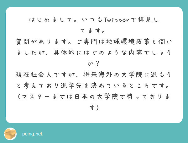質問者Xさん「はじめまして。いつもTwitterで拝見しています。質問があります。ご専門は地球環境政策と伺いましたが、具体的にはどのような内容でしょうか?現在社会人ですが、将来海外の大学院に進もうと考えており、進学先を決めているところです。(マスターまでは日本の大学院で持っております)」