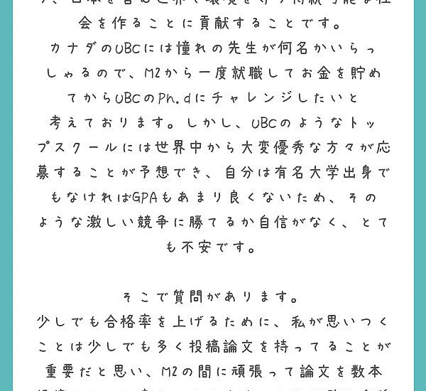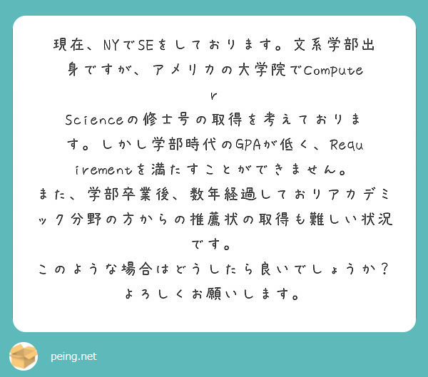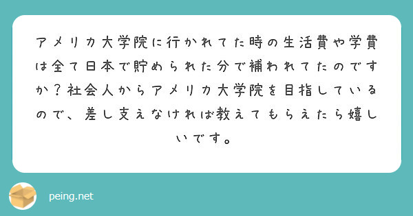 質問者Tさん「アメリカ大学院に行かれてた時の生活費や学費は全て日本で貯められた分で補われてたのですか?社会人からアメリカ大学院を目指しているので、差し支えなければ教えてもらえたら嬉しいです。」 僕「そうですね。2年間東京でSEをやって留学資金を貯めました。留学の1年目はその東京で働いたお金で補いました。2年目からは大学からお金をもらったり、研究室に雇ってもらったりしましたよ。社会人からの大学院留学なら、しっかりお金を日本で貯めるかしてからの方が良いかなーと思います。特にMBAとかMAのマスタープログラムでは、留学生が大学から奨学金や研究して給料をもらうのはなかなか難しいと思いますよ。ただ留学生でもキャンパス内だと週20時間働けるとかあるかもしれないので、留学生オフィスに相談するといいですよ。事務や図書館で働くとか可能かもしれません。